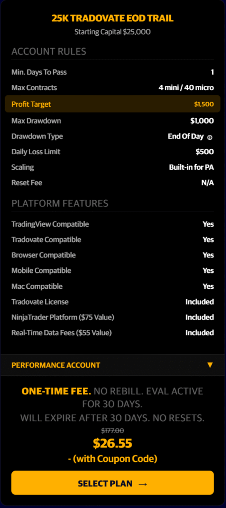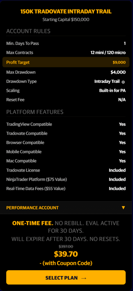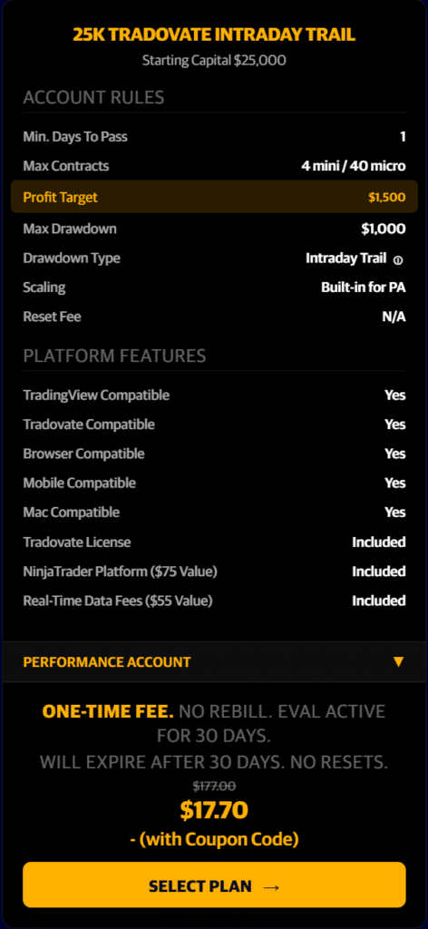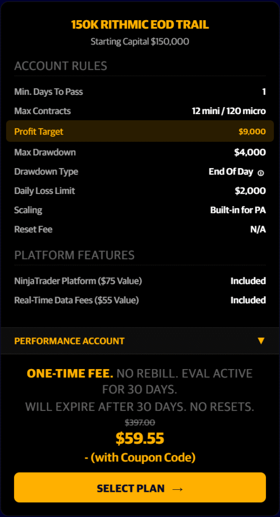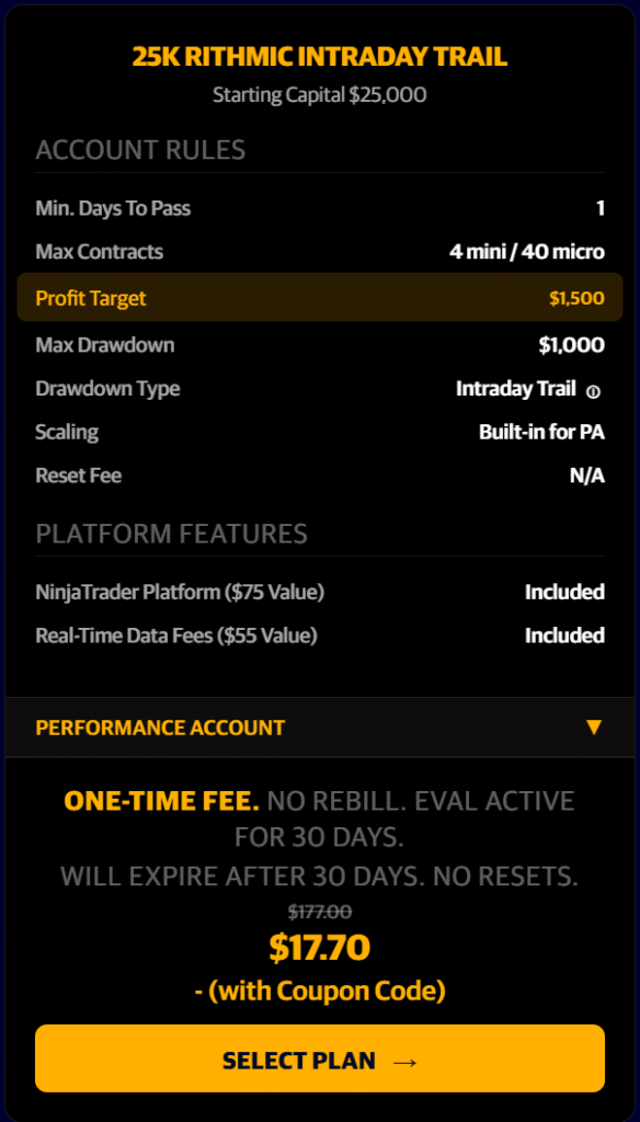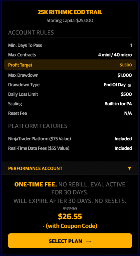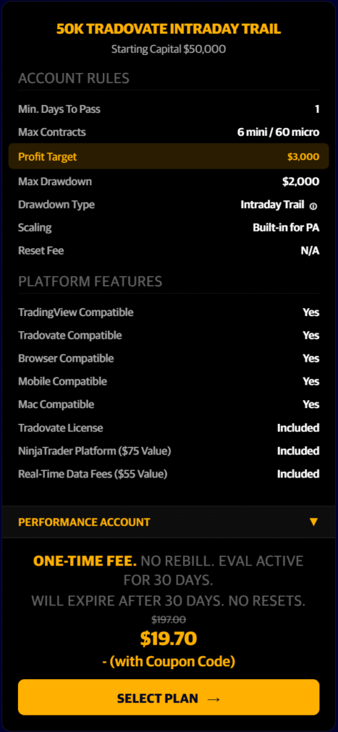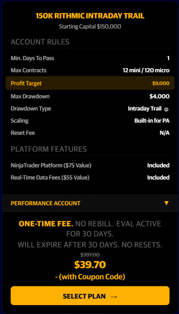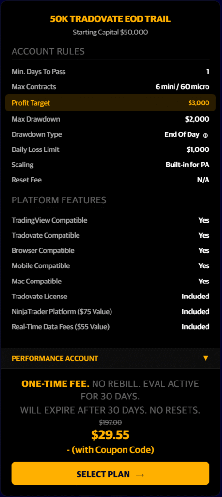 90% off the First Month…BUT also 50% off the recurring months as well!!! Any Size Evaluation Account. One Day To Pass!!! Pass an Eval and convert into a PA Account in just one trading day!